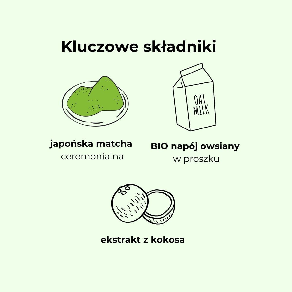 bezglutenowy proszek owsiany* (76,2%), ekstrakt z kokosa*, japońska herbata zielona matcha* (7,6%), sól himalajska.