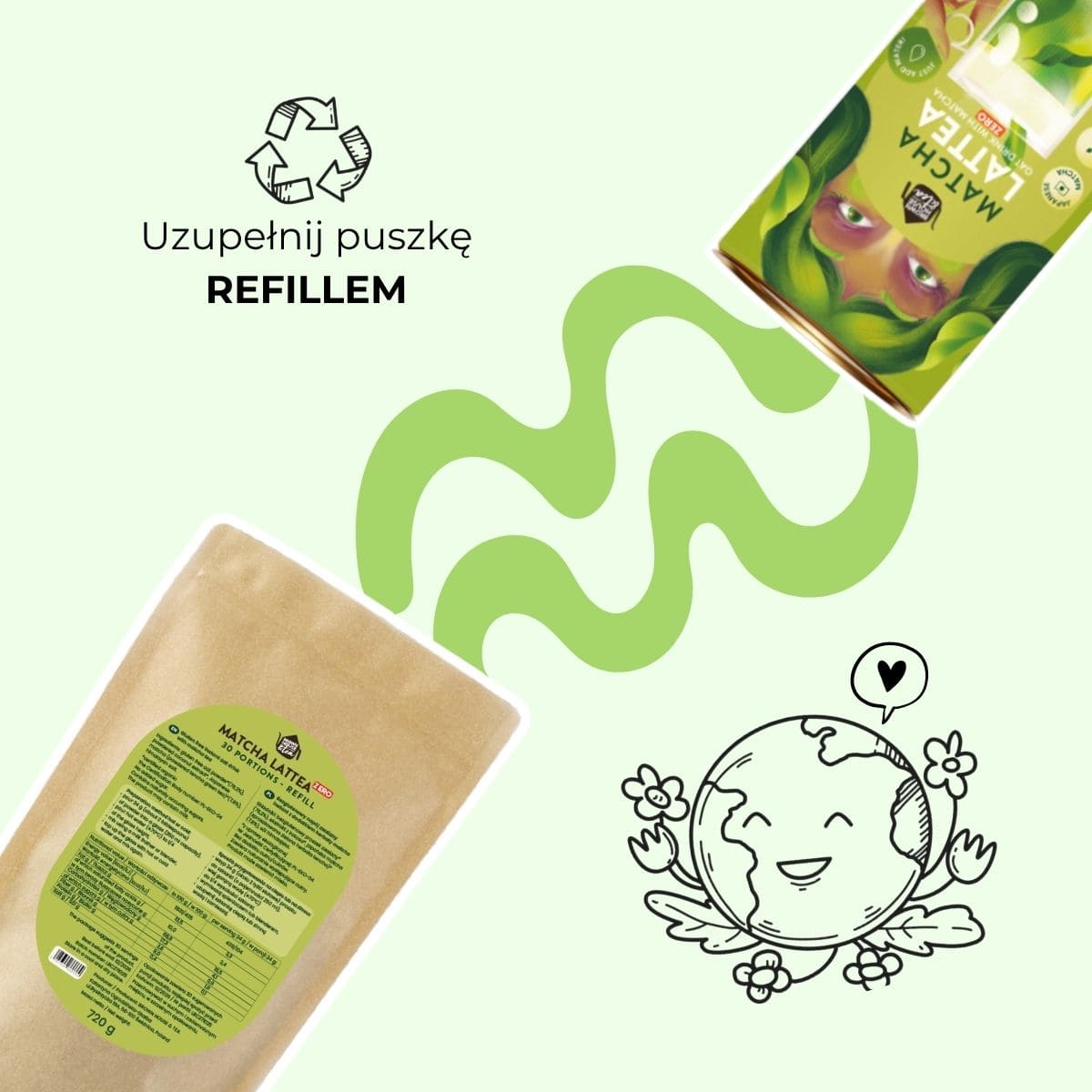 Nasza Matcha Lattea ma jedną poważną wadę… szybko widać w niej denko. :c Ale spokojnie! Zamiast ją wyrzucać, możesz wybrać uzupełnienie w szczelnej torbie. REFILL wystarczy Ci na 30 porcji (3 uzupełnienia). To ulga dla portfela (min. 20% taniej) i środowiska!