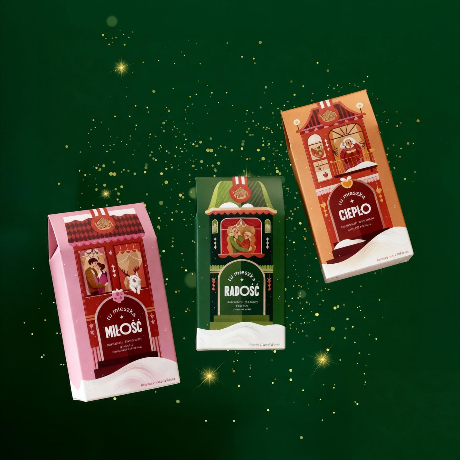 Tu Mieszka Radość” to jedna z trzech herbat z kolekcji Świąteczne Miasteczko — obok „Tu Mieszka Miłość” i „Tu Mieszka Ciepło”. Każda z nich opowiada swoją własną historię świątecznych emocji — o miłości, wdzięczności i rodzinnym cieple.
